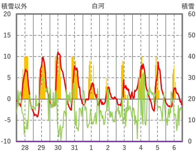 | 日 | 時 | 気温 | 降水 | 風向/風速 | 日照 | 積雪 | 降雪 |