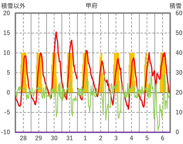 | 日 | 時 | 気温 | 降水 | 風向/風速 | 日照 | 積雪 | 降雪 |