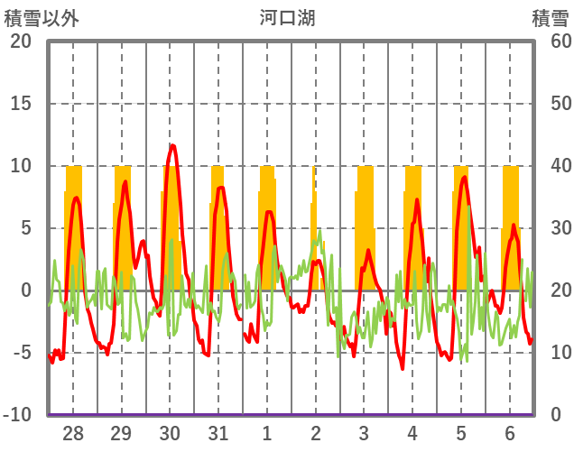 | 日 | 時 | 気温 | 降水 | 風向/風速 | 日照 | 積雪 | 降雪 |