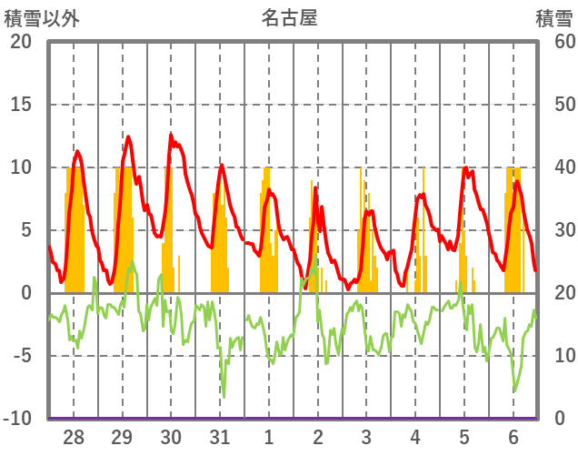 | 日 | 時 | 気温 | 降水 | 風向/風速 | 日照 | 積雪 | 降雪 |