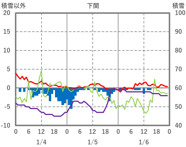 | 日 | 時 | 気温 | 降水 | 風向/風速 | 日照 | 積雪 | 降雪 |