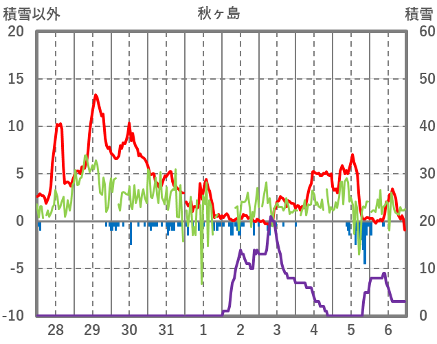 | 日 | 時 | 気温 | 降水 | 風向/風速 | 日照 | 積雪 | 降雪 |