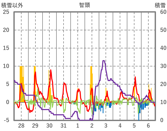 | 日 | 時 | 気温 | 降水 | 風向/風速 | 日照 | 積雪 | 降雪 |