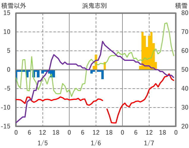 | 日 | 時 | 気温 | 降水 | 風向/風速 | 日照 | 積雪 | 降雪 |