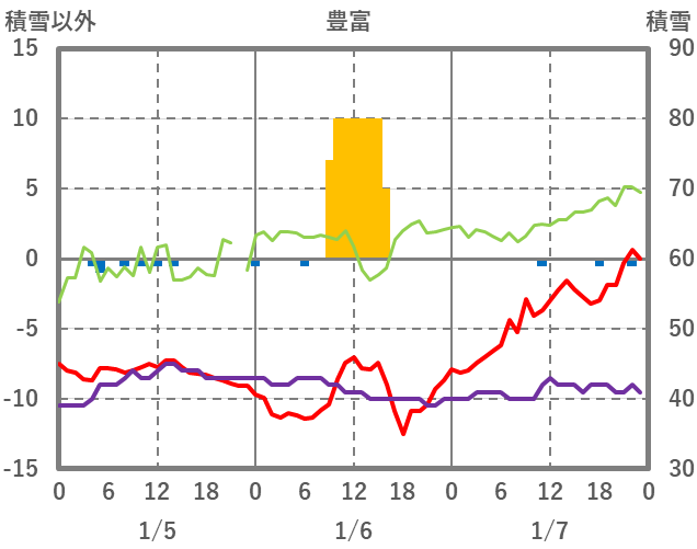 | 日 | 時 | 気温 | 降水 | 風向/風速 | 日照 | 積雪 | 降雪 |