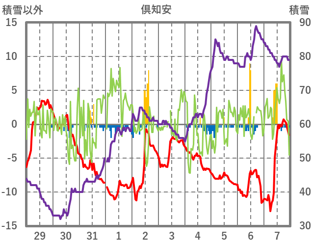 | 日 | 時 | 気温 | 降水 | 風向/風速 | 日照 | 積雪 | 降雪 |