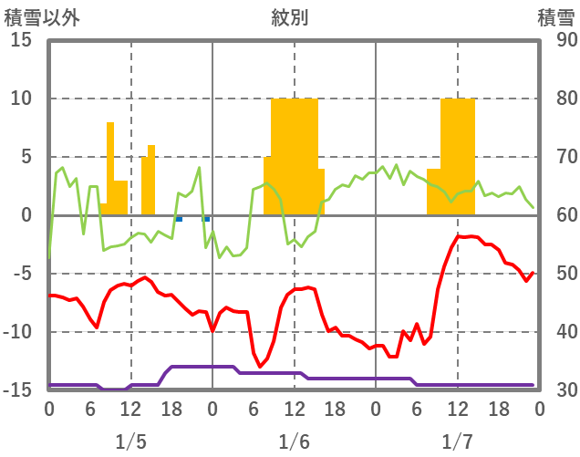 | 日 | 時 | 気温 | 降水 | 風向/風速 | 日照 | 積雪 | 降雪 |