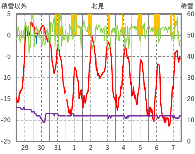 | 日 | 時 | 気温 | 降水 | 風向/風速 | 日照 | 積雪 | 降雪 |