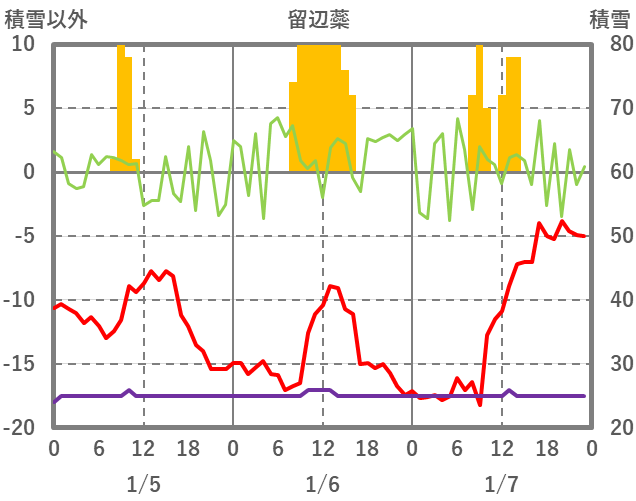 | 日 | 時 | 気温 | 降水 | 風向/風速 | 日照 | 積雪 | 降雪 |