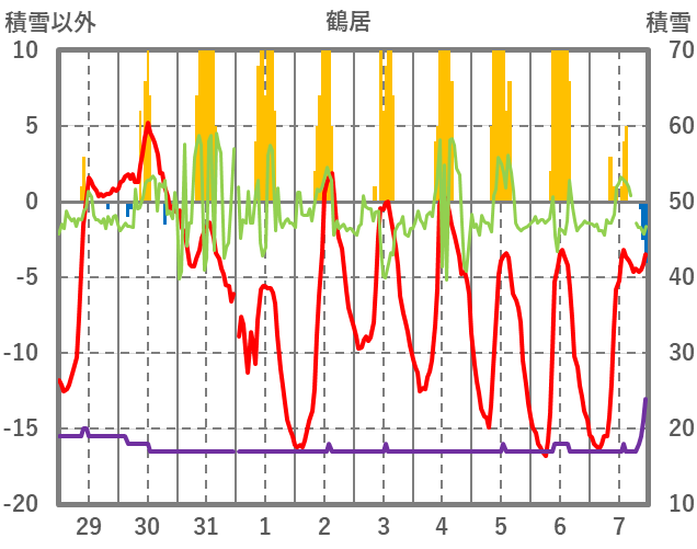 | 日 | 時 | 気温 | 降水 | 風向/風速 | 日照 | 積雪 | 降雪 |