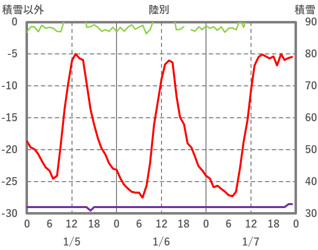 | 日 | 時 | 気温 | 降水 | 風向/風速 | 日照 | 積雪 | 降雪 |