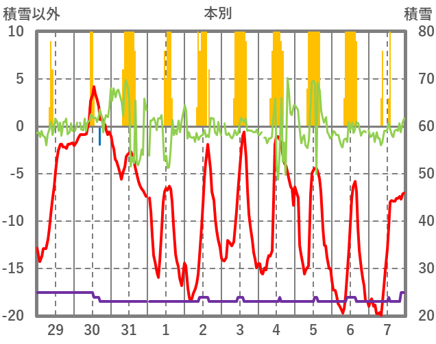 | 日 | 時 | 気温 | 降水 | 風向/風速 | 日照 | 積雪 | 降雪 |