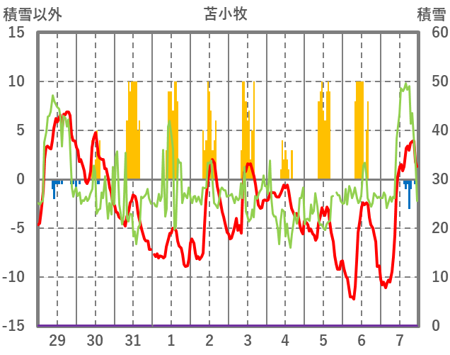 | 日 | 時 | 気温 | 降水 | 風向/風速 | 日照 | 積雪 | 降雪 |