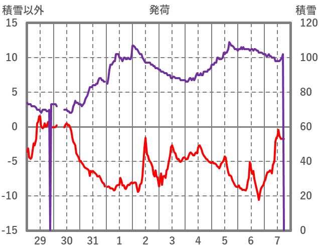 | 日 | 時 | 気温 | 降水 | 風向/風速 | 日照 | 積雪 | 降雪 |