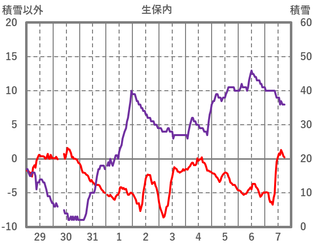 | 日 | 時 | 気温 | 降水 | 風向/風速 | 日照 | 積雪 | 降雪 |