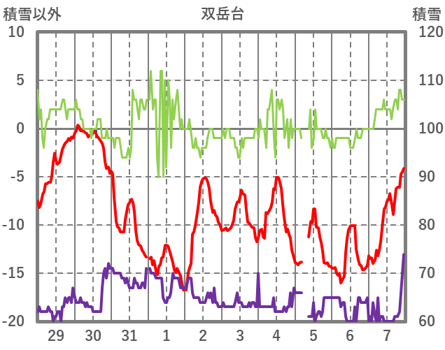 | 日 | 時 | 気温 | 降水 | 風向/風速 | 日照 | 積雪 | 降雪 |