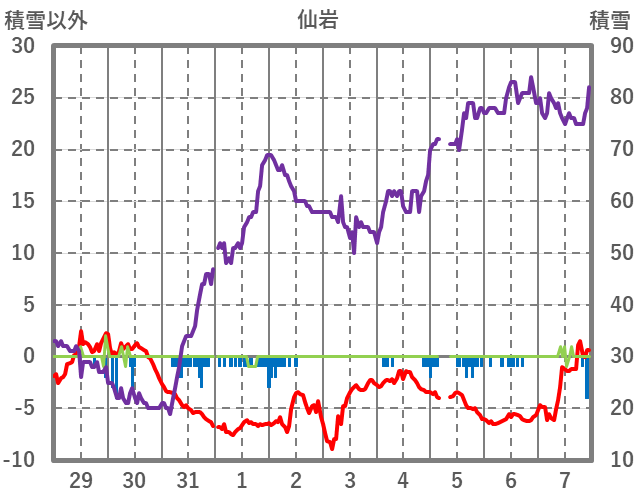 | 日 | 時 | 気温 | 降水 | 風向/風速 | 日照 | 積雪 | 降雪 |