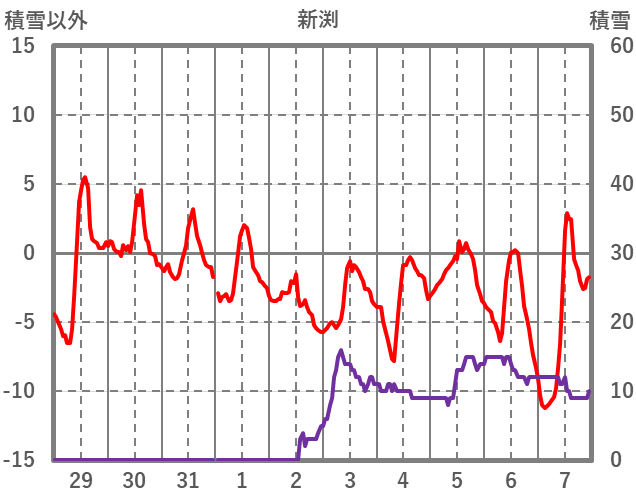 | 日 | 時 | 気温 | 降水 | 風向/風速 | 日照 | 積雪 | 降雪 |
