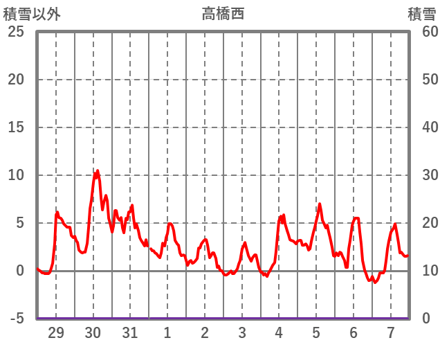 | 日 | 時 | 気温 | 降水 | 風向/風速 | 日照 | 積雪 | 降雪 |