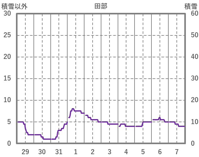 | 日 | 時 | 気温 | 降水 | 風向/風速 | 日照 | 積雪 | 降雪 |