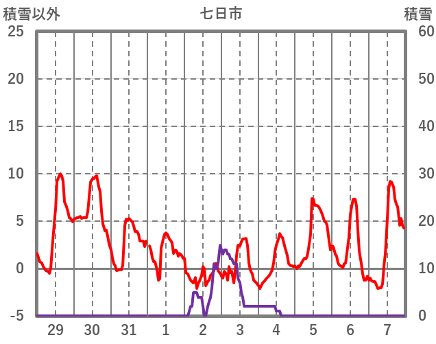 | 日 | 時 | 気温 | 降水 | 風向/風速 | 日照 | 積雪 | 降雪 |