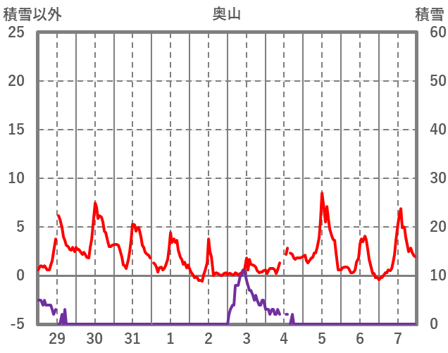 | 日 | 時 | 気温 | 降水 | 風向/風速 | 日照 | 積雪 | 降雪 |
