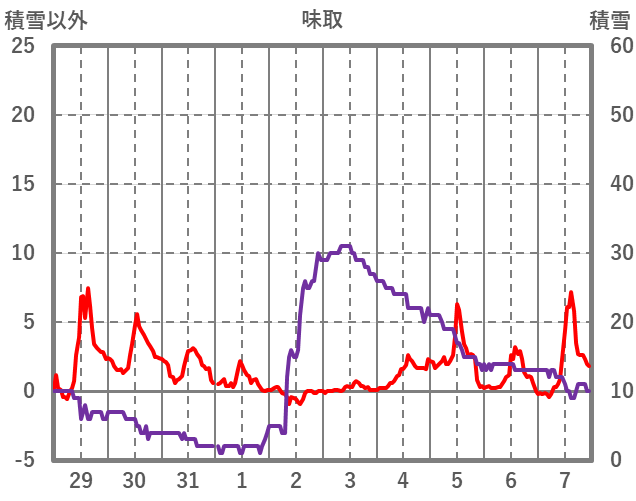 | 日 | 時 | 気温 | 降水 | 風向/風速 | 日照 | 積雪 | 降雪 |