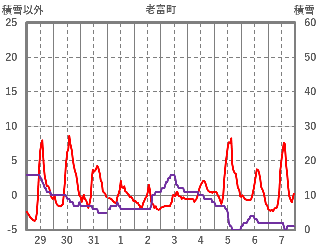 | 日 | 時 | 気温 | 降水 | 風向/風速 | 日照 | 積雪 | 降雪 |