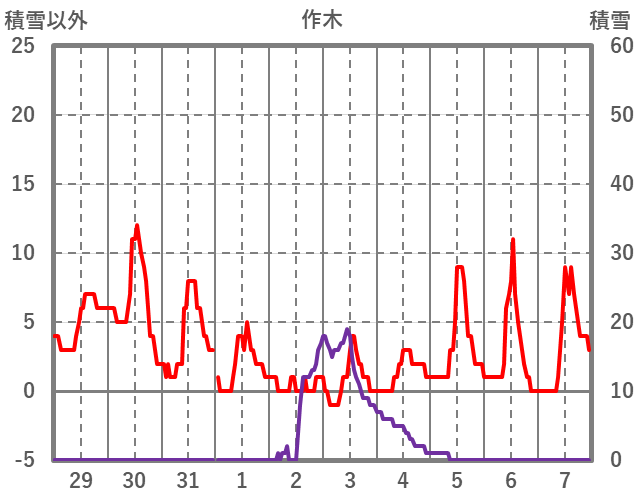 | 日 | 時 | 気温 | 降水 | 風向/風速 | 日照 | 積雪 | 降雪 |