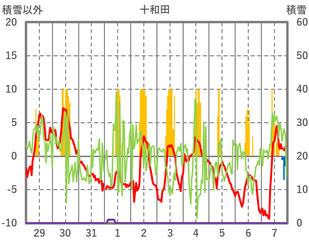 | 日 | 時 | 気温 | 降水 | 風向/風速 | 日照 | 積雪 | 降雪 |
