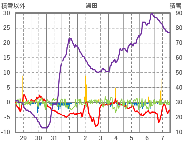| 日 | 時 | 気温 | 降水 | 風向/風速 | 日照 | 積雪 | 降雪 |