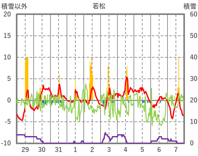 | 日 | 時 | 気温 | 降水 | 風向/風速 | 日照 | 積雪 | 降雪 |