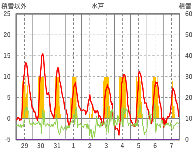 | 日 | 時 | 気温 | 降水 | 風向/風速 | 日照 | 積雪 | 降雪 |