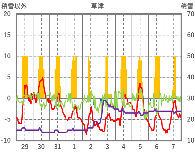 | 日 | 時 | 気温 | 降水 | 風向/風速 | 日照 | 積雪 | 降雪 |
