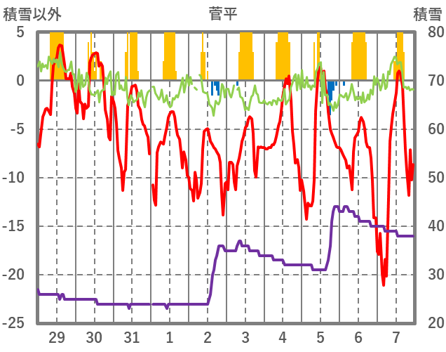 | 日 | 時 | 気温 | 降水 | 風向/風速 | 日照 | 積雪 | 降雪 |