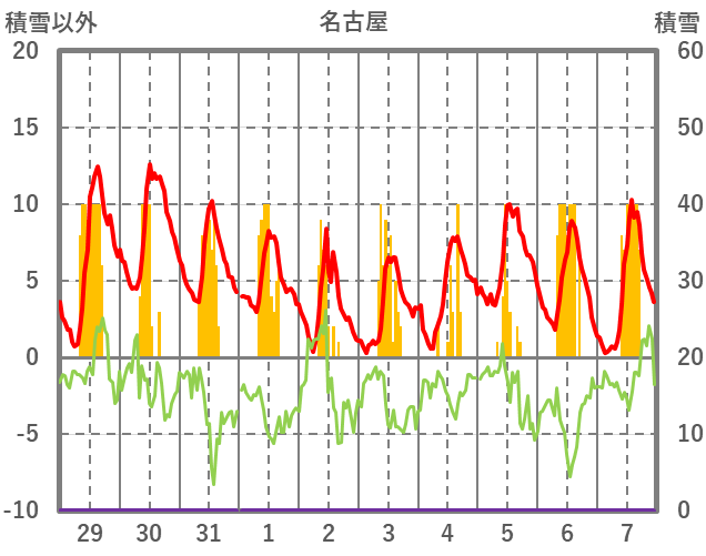 | 日 | 時 | 気温 | 降水 | 風向/風速 | 日照 | 積雪 | 降雪 |