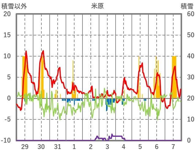 | 日 | 時 | 気温 | 降水 | 風向/風速 | 日照 | 積雪 | 降雪 |