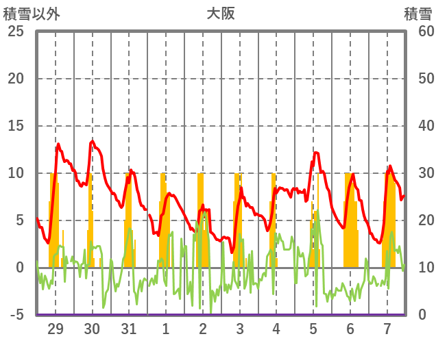 | 日 | 時 | 気温 | 降水 | 風向/風速 | 日照 | 積雪 | 降雪 |