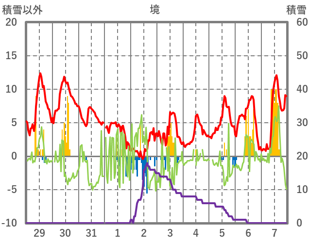 | 日 | 時 | 気温 | 降水 | 風向/風速 | 日照 | 積雪 | 降雪 |
