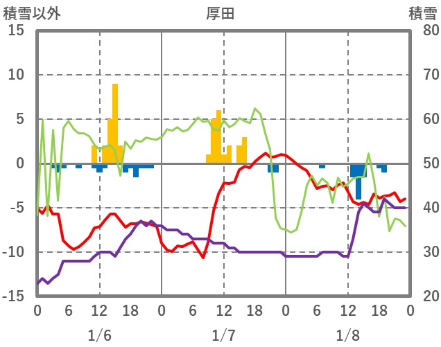 | 日 | 時 | 気温 | 降水 | 風向/風速 | 日照 | 積雪 | 降雪 |