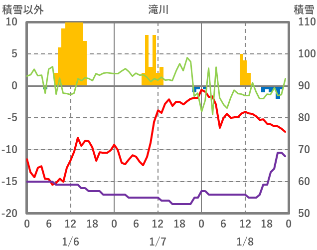 | 日 | 時 | 気温 | 降水 | 風向/風速 | 日照 | 積雪 | 降雪 |