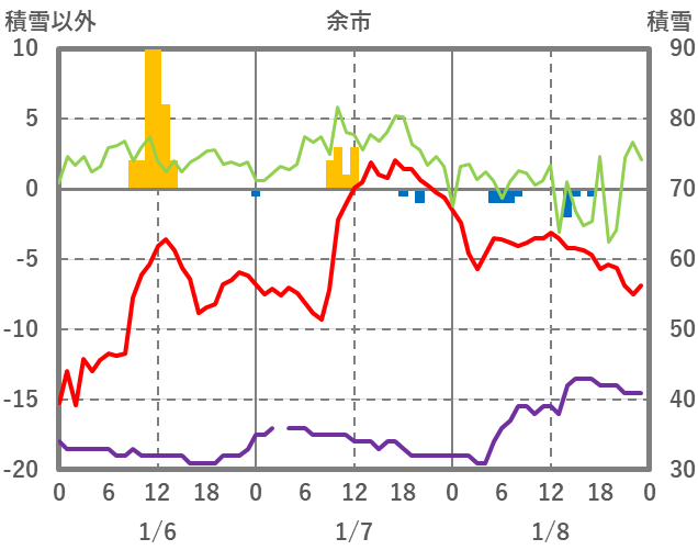 | 日 | 時 | 気温 | 降水 | 風向/風速 | 日照 | 積雪 | 降雪 |