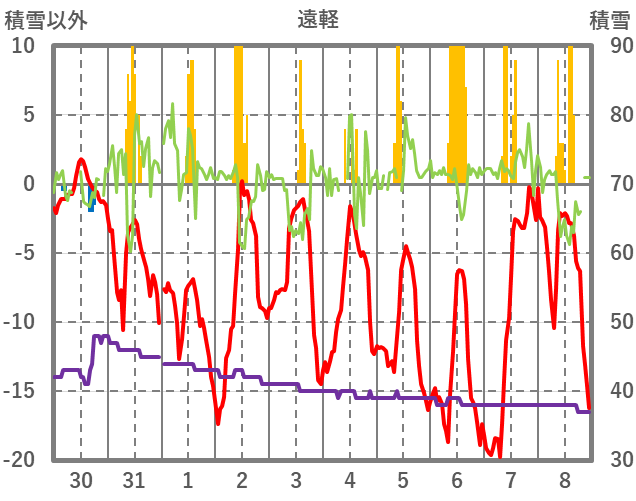 | 日 | 時 | 気温 | 降水 | 風向/風速 | 日照 | 積雪 | 降雪 |