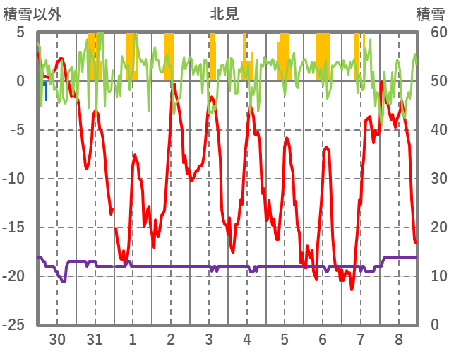 | 日 | 時 | 気温 | 降水 | 風向/風速 | 日照 | 積雪 | 降雪 |