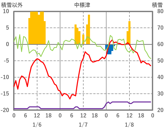 | 日 | 時 | 気温 | 降水 | 風向/風速 | 日照 | 積雪 | 降雪 |