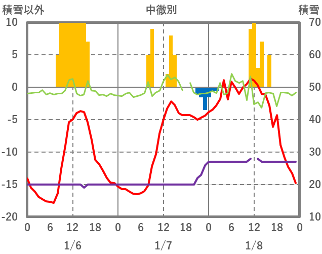 | 日 | 時 | 気温 | 降水 | 風向/風速 | 日照 | 積雪 | 降雪 |