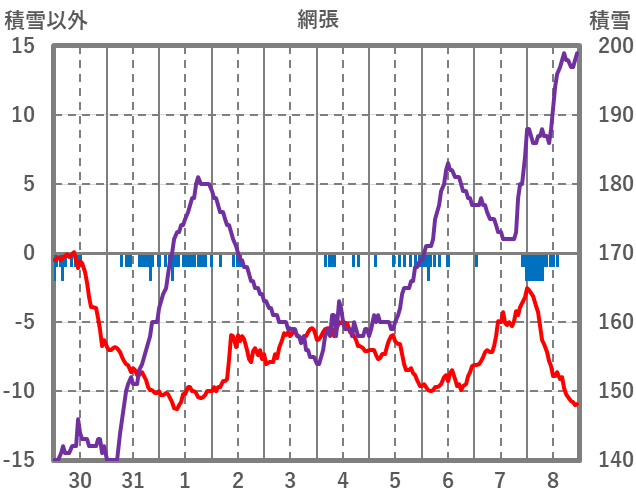 | 日 | 時 | 気温 | 降水 | 風向/風速 | 日照 | 積雪 | 降雪 |