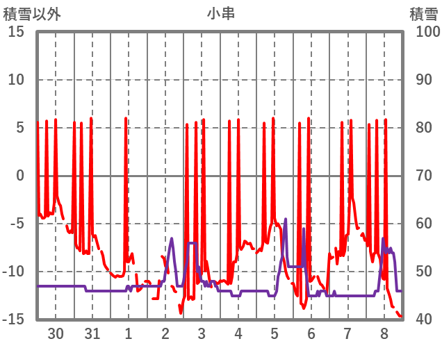 | 日 | 時 | 気温 | 降水 | 風向/風速 | 日照 | 積雪 | 降雪 |