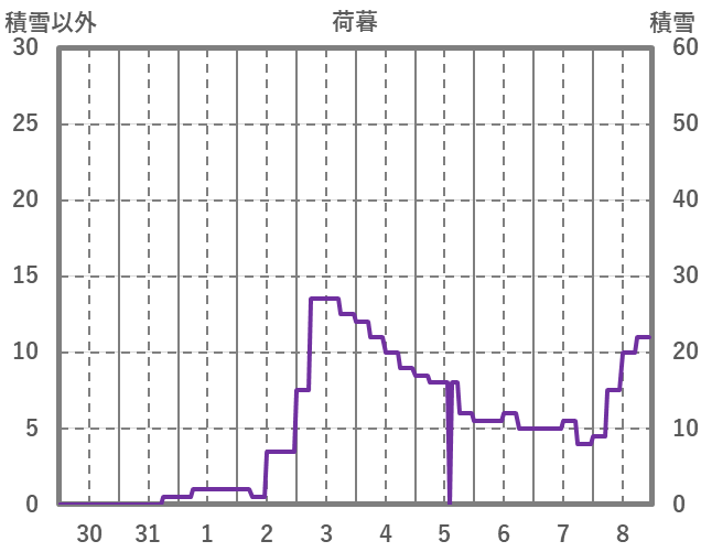 | 日 | 時 | 気温 | 降水 | 風向/風速 | 日照 | 積雪 | 降雪 |