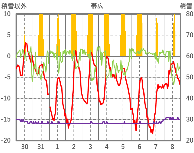 | 日 | 時 | 気温 | 降水 | 風向/風速 | 日照 | 積雪 | 降雪 |